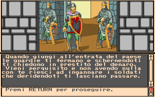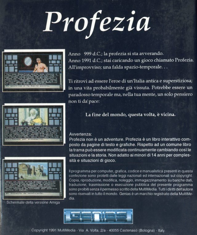 Profezia is an adventure game with a multiple-choice interface: as opposed to classic adventures where the player is free to roam around the game world (or part of it), the storyline in Profezia develops automatically. Whenever an action is to be taken, the player is presented with a set of choices, which will affect the rest of the adventure.