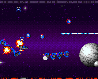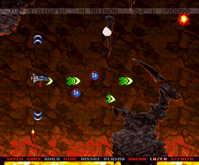 These give off blue power-up tokens, which are used towards selecting one of many weapons. There are 4 front-firing options (guns, plasma, magma and laser-beams - guns can be built up quickly but lack top-end power compared to the others) as well as speed-up (only requires one token), side-shot, up to 3 homing missiles, build (a quick super-destructive blast that only functions when you aren't using auto-fire) and stealth (a period of invulnerability).