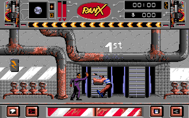 Ranx will fight with ninjas, homosexuals, the Chinese, and others, using his kicks and punches. Items can be picked up including pieces for later repairs and items which can be sold when talking to other characters. Destroy street lamps to get money, but make sure the police don't see.