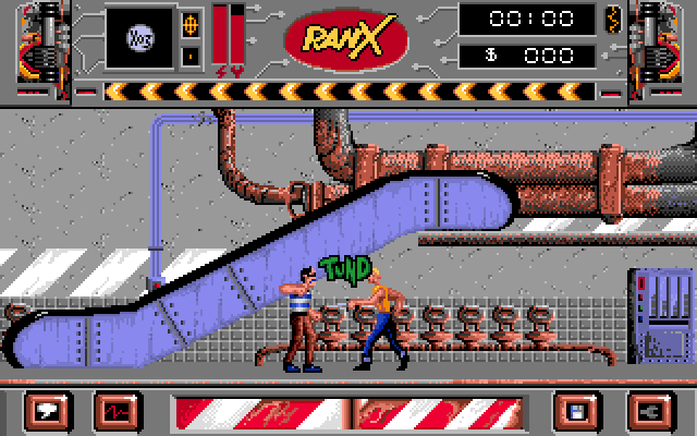 Ranx will fight with ninjas, homosexuals, the Chinese, and others, using his kicks and punches. Items can be picked up including pieces for later repairs and items which can be sold when talking to other characters. Destroy street lamps to get money, but make sure the police don't see.