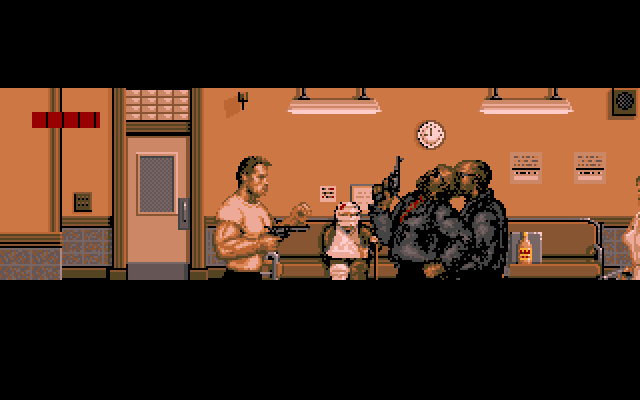 The game is essentially a side-scrolling beat'em up in the vein of Vigilante. As Danko, you proceed across four levels which follow the movie's original setting, where you are constantly attacked by members of the Cleanheads, a group of drug-dealers who are in business with Victor Rosta. To eliminate hostiles you can either punch them (slow but long-ranged) or head-butt them (close-ranged but faster). The only defensive move available is crouching, so as to avoid being hit - there is no jumping or any other evasive tactics. Occasionally, you can get hold of a handgun and fire six shots at the villains. Other items you can pick up will boost your health, grant you access to bonus levels, or cause you to lose control of Danko for a few seconds.