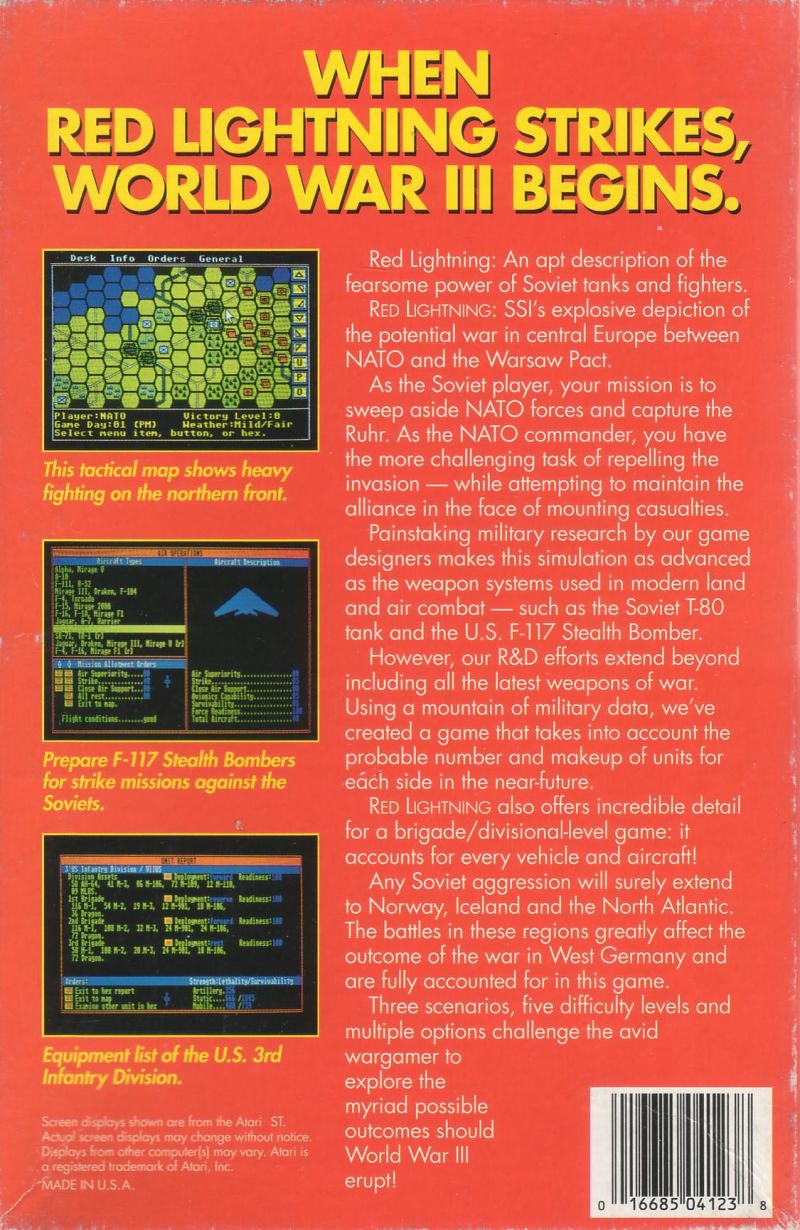 | __long_description | Red Lightning is an operational level wargame of a potential conflict in central Europe between NATO and the Warsaw Pact. It's a game of a hypothetical World War III in the early 1990's. As the Soviet player, the mission is to sweep aside NATO forces and capture the Ruhr. As the NATO commander, the mission is to stop the Russion invasion. |