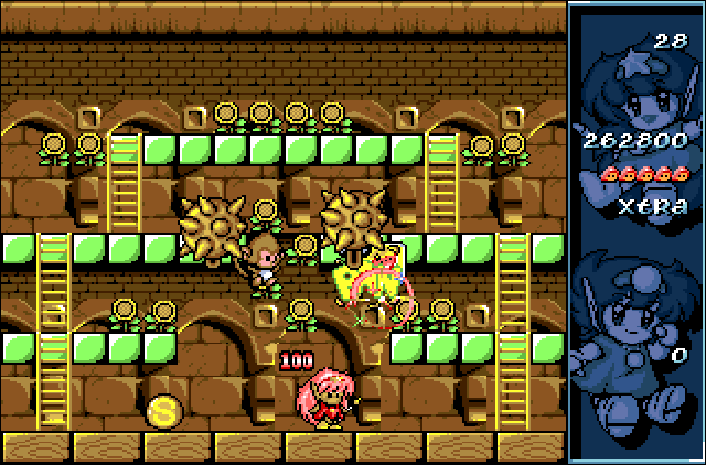 Each level also contains a certain amount of fruit. If you can collect all of this (with some bad guys still alive - you move on immediately once they're gone) you enter a bonus game, in which each enemy's death results in one of the letters E,X,T,R and A being released - collect them all for an invaluable extra life.