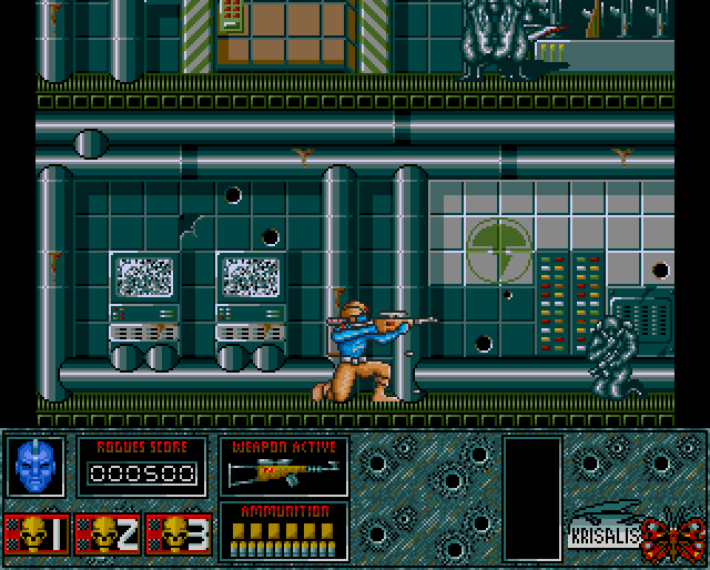 Rogue Trooper is a Genetic Infantryman (G.I.) of the future whose entire battalion was wiped out on their first mission in the Quartz Zone of Nu Earth. Rogue must navigate many platform levels and several first person style flying levels to get to the root of the treachery. He is assisted by three bio chips containing the personalities of three of his dead buddies; Gunnar, Helm and Bagman - unfortunately, Bagman's silicon is deteriorating. The plot is helped along with comic pages between levels. This game is based on the long-running 2000 AD comic character of the same name.