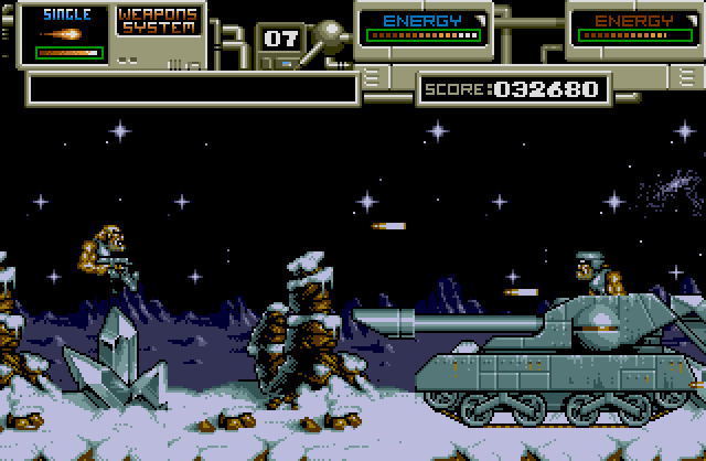 Gameplay is a Gryzor style flip-screen run'n'gun shooter (with occasional jetpack flights), with fairly unrelenting action. Power-ups are issued by a canister which the player will have to control in order to gain the weapon they want. The difficulty level is pitched high, as with Project X which was released at a similar time. |