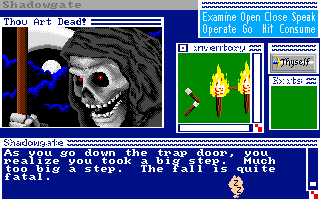 Using the same graphical interface as Deja Vu, Shadowgate is an adventure game set in a fantasy world. Players take the part of an adventurer sent to the ancient keep of Shadowgate on a quest to find a mystic artifact known as the Staff of Ages and stop the evil Warlock Lord from summoning a horrific demon known as the Behemoth. However, Shadowgate has become infested with the Warlock Lord's demonic minions, not to mention the castle's still functional booby-traps.