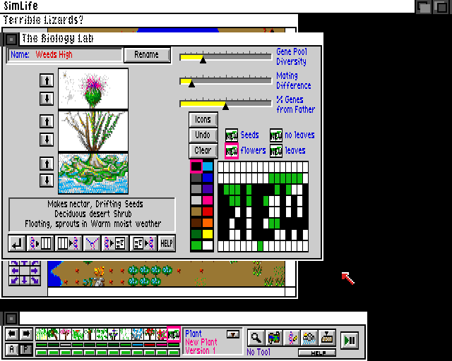 While earlier Maxis games involved developing ant colonies, buildings or planets, Sim Life is directed at creating and sustaining plants and animals. As in previous Maxis titles, Sim Life features both a macro and micro approach to its subject matter. Not only will you be challenged to build an ecosystem by adjusting such variables as climate, physics, time, and elevation, but you can also create new species by either splicing genes or mixing three different parts from existing animals or plants. Creatures will evolve and mutate over time, interact with others, and may even become extinct due to environmental changes. Choose from six preset scenarios, a built-in tutorial, and an option to play an “experimental” or freeform game.