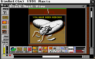 SimAnt at heart is a simple game and doesn't have all the glittery action of adventure and action games but it is, after all, a simulation. What it does have is a great deal of integrity, intrigue and interaction and provides literally hours of immersive game play. The interface, as in most Maxis games, is intuitive and very easy to use. Graphics are what you might expect from an ant simulation, fairly simple in appearance but detailed enough to allow meaningful text, charts and graphs to enhance control. Sound effects are very well done and, in fact, can be toggled off if you don't like the sounds of ant carnage before breakfast.