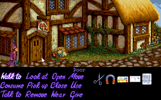 Simon the Sorcerer is a point-and-click adventure game very similar to contemporary LucasArts titles (in particular Monkey Island) in concept and gameplay. It features twelve verbs displayed on the screen at all times for interaction with the environment. Objects that can be interacted with are highlighted when the player hovers the mouse cursor over them. The puzzles are inventory-based: Simon will have to collect and carry a large number of items in order to advance in the game. Almost every character comes with an extended dialogue tree to explore. Most of the conversation choices are used for a humorous effect and are not required to pursue.