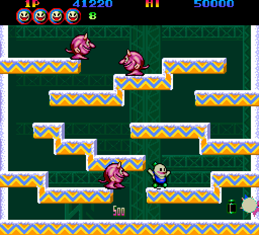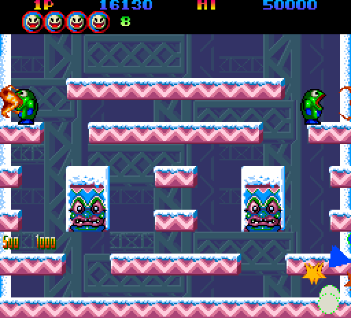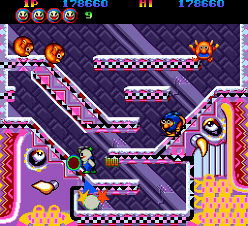 A conversion of the cult fave arcade rave. It's effectively Bubble Bobbie in a snowy clime but with a few appropriate twists and some neat cartoon visuals. It looks and plays identically to its arcade parent - well, save for the absence of the simultaneous two player option (it wasn't implemented because the action would have slowed down from the ideal running speed). Although scheduled for release in mid-1991 and completed, the Amiga conversion was never published. Later, the game was rediscovered and released for free.