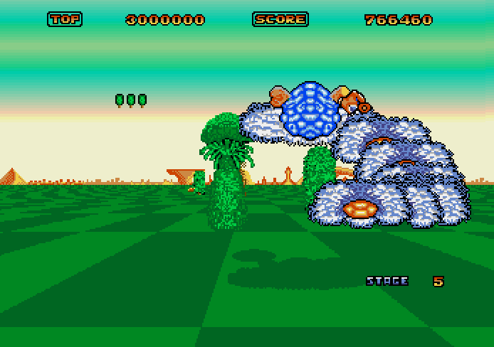 Just when you thought that the end of the world was nigh, when everybody thought it was OK to eat lots of cream cakes 'cos they were gonna die tomorrow anyway, a little speck became visible in the sky. Was it a bird? Was it a helicopter? Was it a speck of chocolate on your glasses? Nope, da da daaaaaa – it was Space Harrier. Yeaaah!