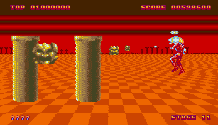 There are 13 stages to complete by jetting around and blasting bad guys and bosses as they approach. The game is played from behind the main character and the landscape rushes up in 3D similar to the effect used in many car games such as Outrun.