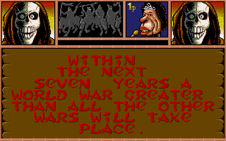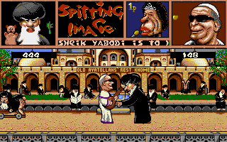 Having chosen which to play as, you travel to an opponent's country to engage in a best-of-three fight that is judged by Queen Elizabeth II on a postage stamp. You attack each opponent on the ground as well as jumping in the air and each character has a special move like Thatcher's head-butt or Khomeini's beard whip. You can also call for help twice from an aide who will usually throw a projectile at your opponent. If you manage to defeat all 5 opponents, you will meet the mysterious leader in a final showdown in a mud-wrestling pit in the dark where you will only be able to see the eyes of the characters. You can also play 2-player fights, one against another on the same computer. |
