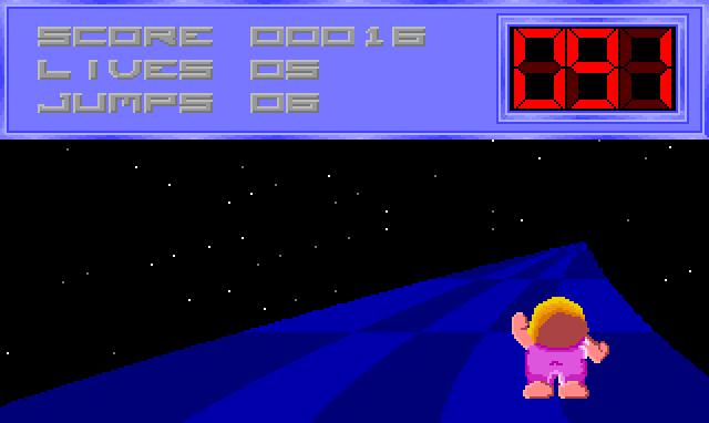 The basics of the game are clear. You have a fat baby figure who ploughs up the screen and has to make it through the various zones within a time limit. Holes and tiles help and hinder you by causing you to fall through or jump over gaps. Put simply you have seven jumps and 99 seconds to complete each level.