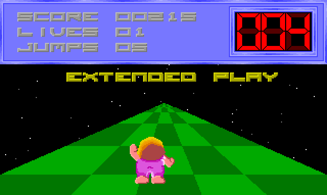The basics of the game are clear. You have a fat baby figure who ploughs up the screen and has to make it through the various zones within a time limit. Holes and tiles help and hinder you by causing you to fall through or jump over gaps. Put simply you have seven jumps and 99 seconds to complete each level.