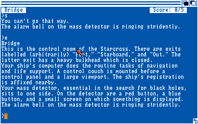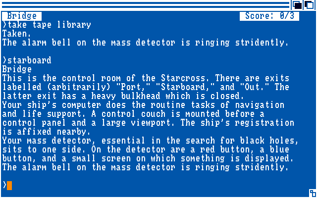The game's hallmarks lie in top-notch writing and very well-designed puzzles. Alien artifacts and locations are described so vividly they spark your interest in exploration. As one of Infocom's earliest games, the parser is limited and does not allow shortcuts that IF fans would consider indispensable. The game's only weakness is the NPCs, who are not as well fleshed out as Infocom's other games. Your ship's computer is still amusing, though.