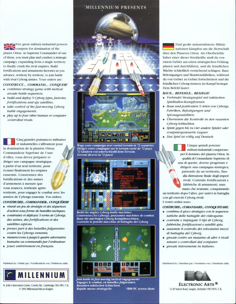 | __long_description | The game has two basic components. The first requires the player to engage in Risk-like strategic decision-making with the goal of conquering the given land mass. The player raises cyborg armies to accomplish this goal. During the second basic component of the game, the top-down battle mode, players can choose to assume manual control of one cyborg in their army during offensive or defensive battle sessions, or let the computer simulate the battle behind the scenes to much more predictable outcomes. This allows players to play only the Risk-style board game component of the game. The opposite, battles only, is also possible. Cyber Empires innovated by mixing strategy with arcade action on a global scale.