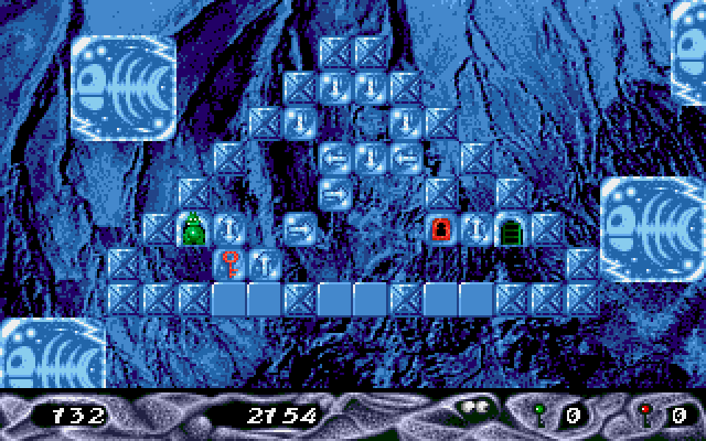Stone Age is a challenging puzzle game where you are in control of a dinosaur and you have to make him reach the exit of each cave. The dinosaur can only walk on certain blocks on the level: some are just ordinary blocks, some are movable in the direction the arrow points, some crumble after you walk on them, and some have coloured keys which are needed to get past locks of the same colour.