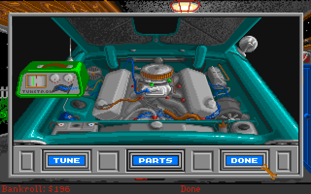 I knew the magazine reviews had said quality was average, but still a decent game. It turned out to be much better than I thought it would be. Lots of emphasis is placed on upgrading your car. You have to spend your money wisely, and pick the best parts for the money. Once your car has been upgraded and modified, you drive it down to the local burger and fries joint. There, you will find a variety of other muscle cars, you can ask to look at their engine, and challenge them to a race. They may even challenge you to a race. Only drivers with cars similar or better will agree to a race. Naturally, as the game goes on, the races go for more money, and some challengers will only race for pink slips, and the game becomes serious. Obviously, losing a race at this level means the game is over.