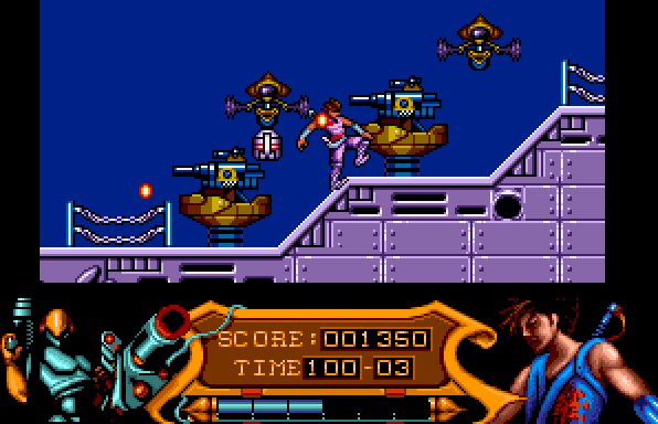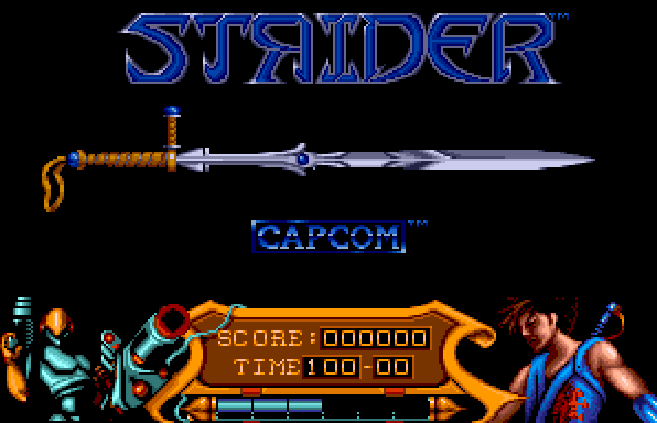 Strider lets the protagonist run, jump, perform acrobatics and climb walls and overhangs. He wields a plasma sword, called a Cypher, through five levels fighting robots and guards, with mid- and end-level bosses.