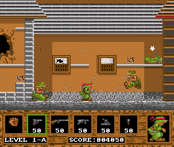 The gameplay is hardly rich in terms of variety: A soldier in the olive uniform has to run through six levels, jump, drive and fly. At first he can fight the other side with his fists, but later will get weapons of all kinds. This makes his journey faster and more explosive, but certainly not more interesting.