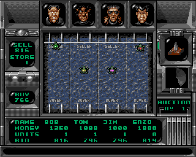 Despite new species, background graphics, and different commodities, gameplay is still M.U.L.E. at its heart: up to four players vie in a cutthroat competition to be the richest businessman in a futuristic economy. The different phases of M.U.L.E., e.g. land grant, production, and marketing, are preserved intact and are greatly enhanced by intuitive mouse-based interface and 16-bit graphics. The auction interface, which is the best part of M.U.L.E., is still as furious and fun as ever, with computer players that are aggressive enough to pose a real challenge. Unlike Linel's Traders, another M.U.L.E. clone, Subtrade does not introduce new gameplay options or the number of commodities.