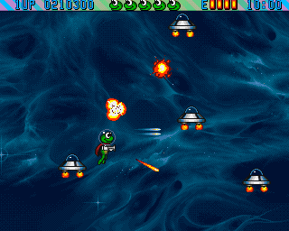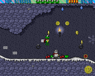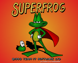 Superfrog is a traditional jump & run platformer. You’re – surprise – a frog. Your enemies are all animals – like bees, hedgehogs or snails. You have no weapons. The only way to kill the enemies is to jump on them. Every stage has a time limit. In this limit you have to collect a pre-determined number of coins. Each of the six worlds has four stages. Every stage has a password. After all you can type your name into a high score table.