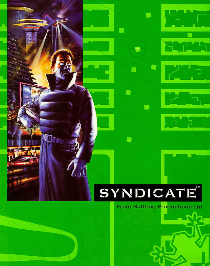 Syndicate is an isometric real-time tactical and strategic game from Bullfrog Productions created in 1993, and released for a variety of platforms beginning with the PC and Commodore Amiga. It is the first title in the Syndicate series. Set in a dystopian future in which corporations have replaced governments, Syndicate puts the player in control of a corporation vying for global dominance.