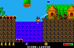The goal of each level is to safely get Tiki through the level, avoiding enemy fire and spikes, and rescue one of his kiwi friends at the end. The weaponry starts out as arrows, but pickups can change these into bombs, lasers or bouncing fireballs. These act a little differently, and what is useful depends upon the player's location. A distinctive feature of this game is the ability to ride a variety of flying vehicles, including balloons, blimps and UFOs. Vehicles can be found ready for use or can be stolen from an enemy.