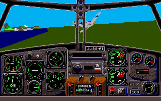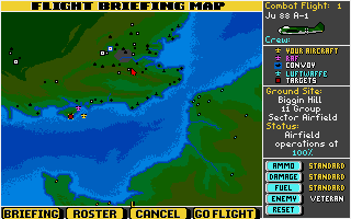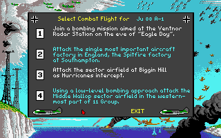 First of all, you can decide which side to fight for, but remember the decision here limits which craft are available to fly – no Spitfires in the Luftwaffe! The Brits have got Hurricanes and Spits to fight in while the German have not only fighters, but medium and long range bombers and dive bombers. Each plane has several missions set aside for it that can be played in any order. The missions are varied and range from straight dogfights to scramble and intercept missions. Once a mission is completed the combat records are updated and stored to disk.