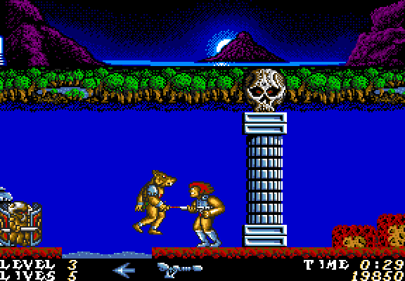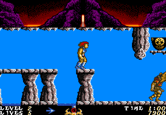 This license of the children's TV show set it as a Ghosts 'N Goblins-style hack-n-slash adventure. The Thundercat must defeat Mumm-Ra's forces, which range from dwarves to bats. Although you start with only a sword, more can be collected by attacking the various containers through the levels - later weapons can destroy these enemies quicker, and allow attacks from a distance. Reaching the end of each level sees bonuses for time and kills. The path through the game can be varied on later levels, so you can play it through more than once and find new sections, even though the individual levels only scroll left-to-right.