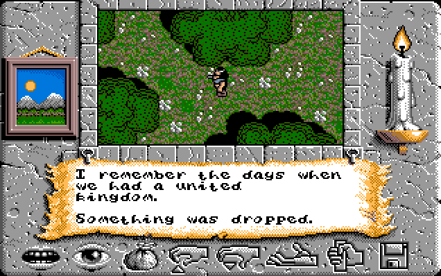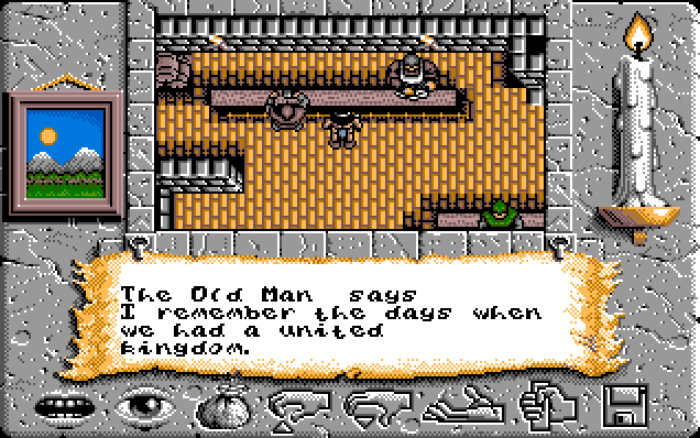 Gameplay consists of moving the protagonist in real-time (day and night) through various terrains, like forests, towns, and dungeons. The player character gathers basic items, like health and magic potions, and increasingly powerful weapons as he completes tasks and advances the plot. Conversations are handled through key phrases. Battles involve a few types of creatures (skeletons, orcs, rogues) of which there can be various flavors.