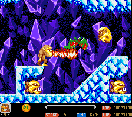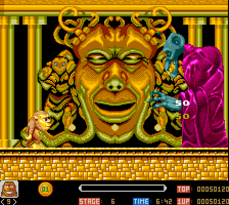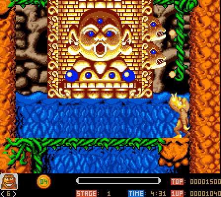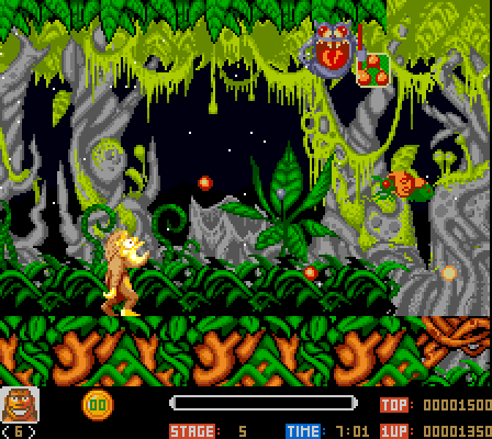 The hero of the game is a young jungle-man named Toki. One day the evil wizard Dr. Stark kidnaps his girlfriend Wanda. When Toki tries to save her, he is turned into a monkey!