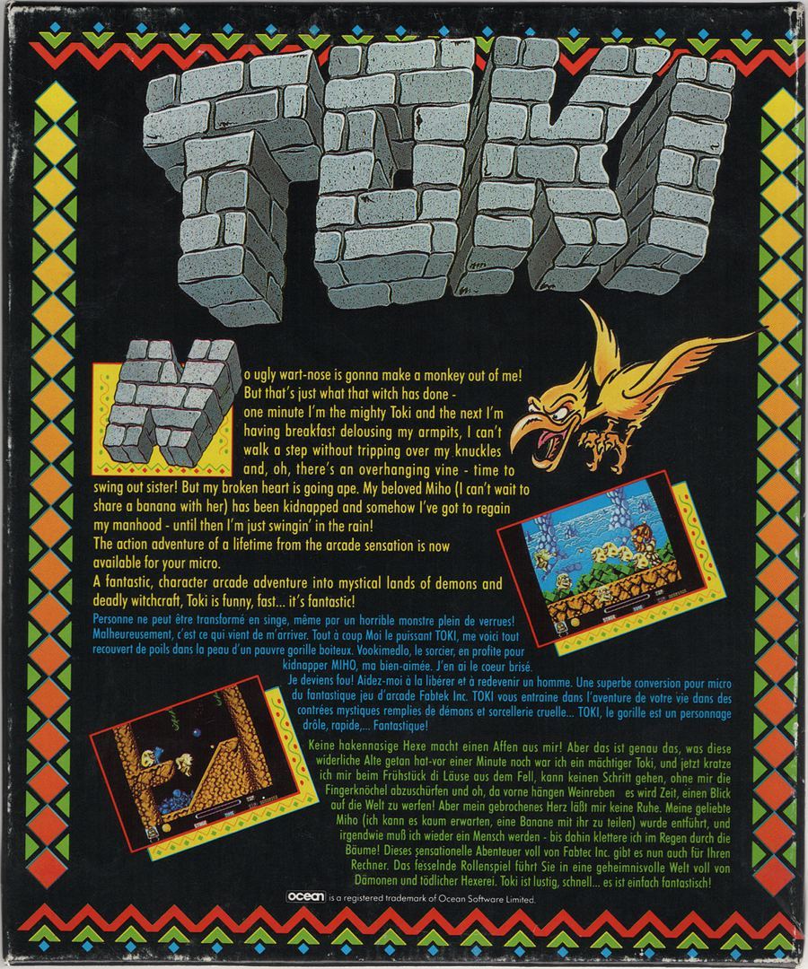 | description | The hero of the game is a young jungle-man named Toki. One day the evil wizard Dr. Stark kidnaps his girlfriend Wanda. When Toki tries to save her, he is turned into a monkey! |