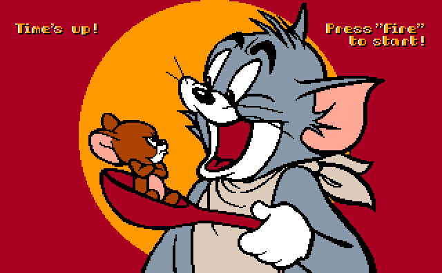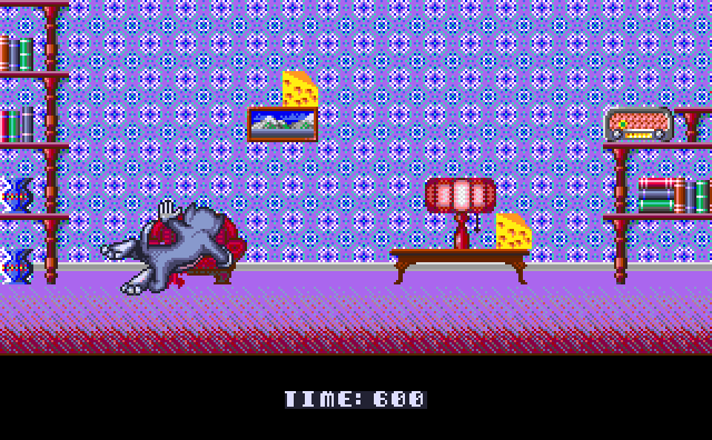 The game's opening credits are promising, with accurate renditions of both characters, and the Amiga's sound capabilities reproduce Tom's manic laughter perfectly. The action, such as it is, takes place in various places about the house that are linked by Jerry's mouseholes. The aim is to guide Jerry through rooms, over shelves and furniture, devouring as much cheese as possible within the time limit of 500 seconds. Tom is in hot pursuit and for every time he catches Jerry you lose 30 seconds. Jerry risks losing a lot more. You can fight back by dropping books, bananas, bowling balls and other sundry items of cartoon mayhem on Tom and, when all else fails, you can escape down the nearest mousehole.