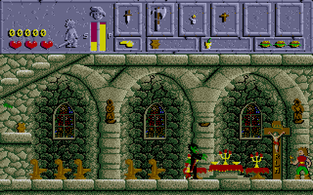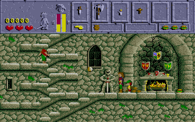 In the game you are controlling Sir Arrow. He may walk; jump; duck; use weapon; collect, combine and use items. Tom is near, but he should be kept in good mood. He may help you to beat monsters, but his energy is exhausting and he should be fed with Hamburgers and Milkshakes. When he is upset, you should give him a Teddy Bear. All such items as well as many others required to progress in the game such as different weapons, magic harp, or lighter, etc. are scattered within the castle. The huge doors either keep bonus items increasing your score, or monsters, or clues to solve the riddles. Tom may walk on his own, and you should blow in whistle to call him back and do not loose him.