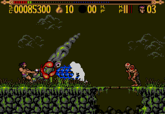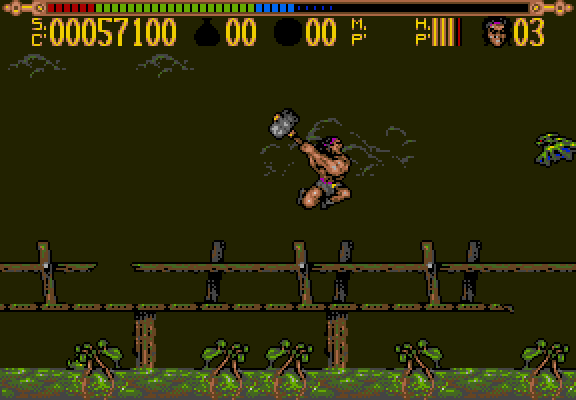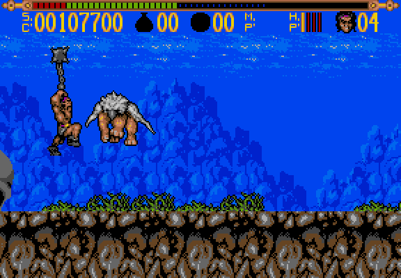 The levels are generally side-scrolling, but sometimes underground passages can be reached via holes. This has no significant effect, though. The gameplay consists of using the four melee weapons which three moves each to get rid of the enemies without dying from their hits. Helpful power ups can be found when destroying parts of the scenery. Besides health refreshments and invincibility, there are also permanent upgrades for Torvak available, e.g. an extended health bar, greater speed or magical enchantments for the weapons. When an upgraded weapon is equipped, a powerful spell can be unleashed by holding the fire button.