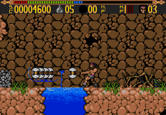The levels are generally side-scrolling, but sometimes underground passages can be reached via holes. This has no significant effect, though. The gameplay consists of using the four melee weapons which three moves each to get rid of the enemies without dying from their hits. Helpful power ups can be found when destroying parts of the scenery. Besides health refreshments and invincibility, there are also permanent upgrades for Torvak available, e.g. an extended health bar, greater speed or magical enchantments for the weapons. When an upgraded weapon is equipped, a powerful spell can be unleashed by holding the fire button. |
