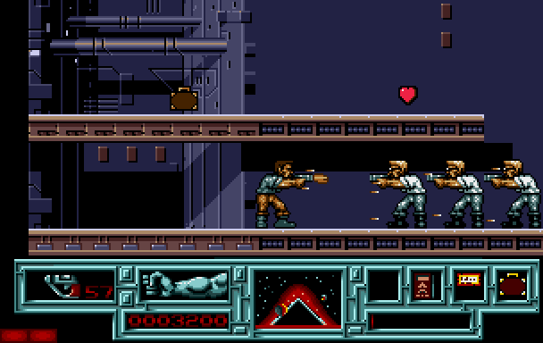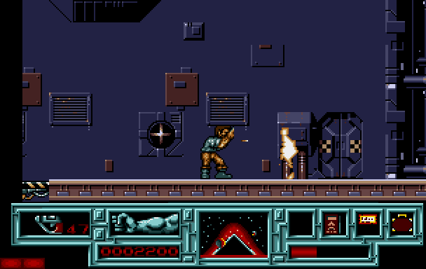 Total Recall for the Amiga and has players controlling Quaid as he fights through seven levels on Earth and Mars. The game alternates between platforming levels and driving levels. Platforming levels require Quaid to fight guards and find the exit. The player may duck to avoid bullets and fight back with both captured weapons and meaty Schwarzenegger fists. The first level requires the player to locate items to open the exit, and a later level has the player switching control between Quaid and resistance fighter Melina to solve a puzzle.