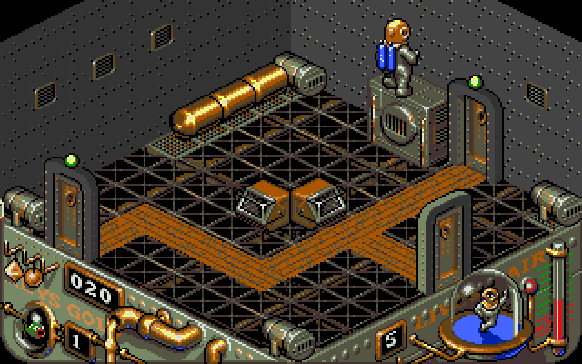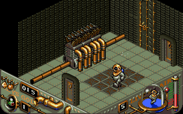 Since the player starts with 2 fishes and only receives a new one at each 80 gold bars collected, most of the time the enemies have to be avoided by staying away or jumping over them. Stacking boxes and other objects stops the fauna from getting to the character (and also allows access to high places). There's an air gauge that is constantly depleting at the bottom-right of the screen. It can be filled with the compressed air tanks scattered in some rooms. Some doors require geometric-shaped keys. These can be collected and stored in three slots at the bottom-left of the screen. The game allows saving at each 50 gold collected.