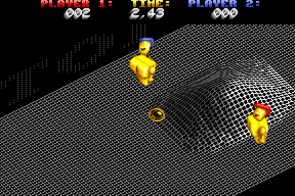 The aim is to score more points than your opponent in each match, and be the first to win four matches (against either a human or computer opponent), before moving up to the next difficulty level. There is a goal in the middle at each end, and the ball can be advanced by shooting it (the length of a shot is affected by pushing the joystick up or down with fire pressed) as you can't run with the ball, or hold onto it for long. The main novel idea in the game is the shaping of the pitches, which are viewed in full 3D and have bumps and big divots all around. |