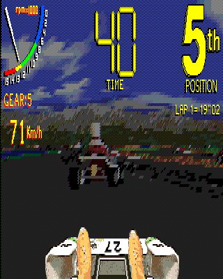 Very much the most serious go-karting simulation even seen, Virtual Karting gives a texture-mapped world running at at least 25fps. There are 3 different circuits on offer, to be raced in any order, each with a full field of computer opponents to face. The AI has a very rigid feel, and it's one of those racing games where they're better thought of as a succession of obstacles, sticking to the same racing line, and carrying on unscathed from contact even if you spin.