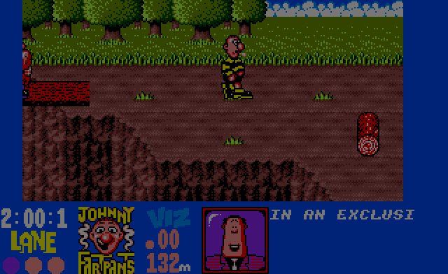 Viz is an action game where the players run through various scrolling environments. It is based on a British comic magazine VIZ which, like the game, features lots of crude humour and fart jokes. The player controls one of the 3 Viz characters - Johnny Fartpants, Buster Gonad, or Biffa Bacon. The race takes place in five different scrolling environments; country, town, building site, beach and a disco. During the race you have to dodge traps and other characters from the VIZ comics. There are also two mini-games for each character which include Pint Drinking, blowing up balloons with farts and Pancake Flattening.