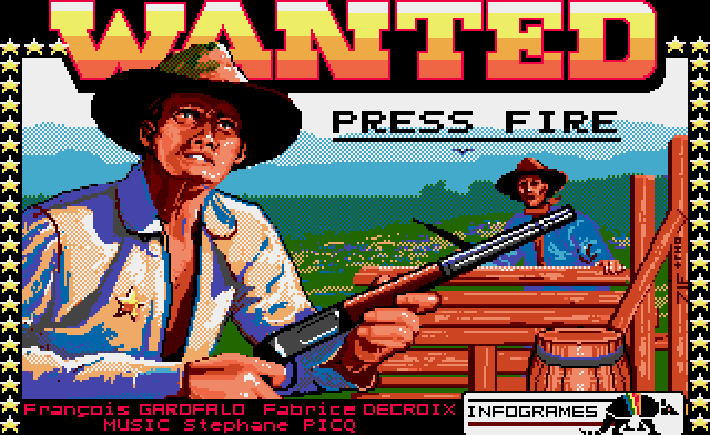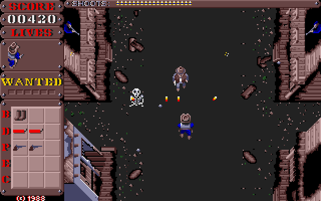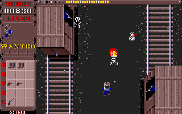 Wanted is a vertically scrolling shooter with a Western theme, similar to Gunsmoke. The player takes the role of a bounty hunter who has to bring four desperadoes to justice. They can be tackled in any order and if all are defeated, a fifth level emerges. The gameplay offers no surprises: shooting masses of enemies until reaching the end of the level. The player can shoot barrels to receive extras, e.g. boots for extra speed or a rifle for a better range. Dynamite destroys every enemy on the screen.