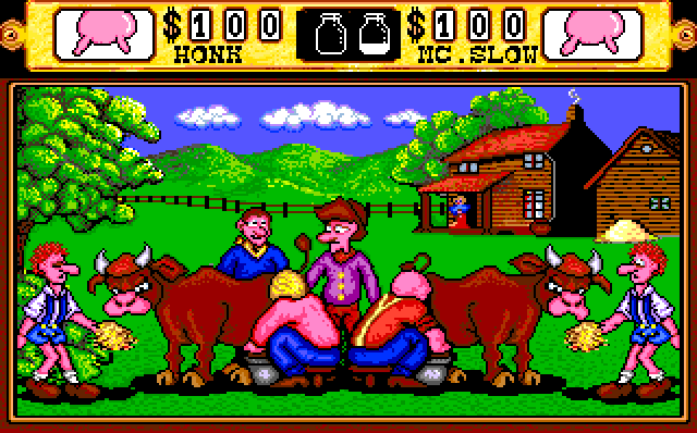The Milking event has a rhythmically heaving udder indicating the beat that you must move the joystick. To fill the cans, the joystick must be moved in a predetermined pattern, but it must be moved rythmically with the udder. You can elbow your opponent to get the upper hand by moving your joystick to the right and pressing the joystick button.