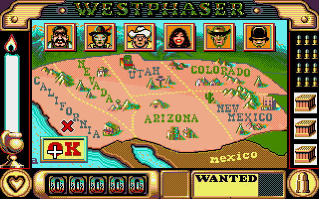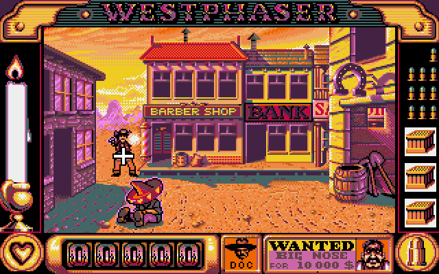 Each location throws wave after wave of humorously-drawn attackers at you - bandits, cowboys, Indians, Mexicans, all thrown together into a big pile of cartoonish violence. A burning candle represents your life bar and there's plenty of enemies trying to snuff it out, so you'll have to be quick on the draw (but don't forget to protect the innocent). When the face of the bandit you're after starts blinking on the status bar, prepare for the showdown: nail them and the reward is yours.