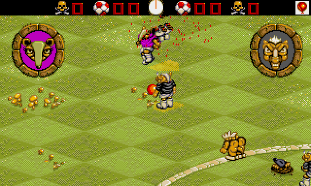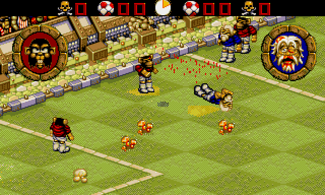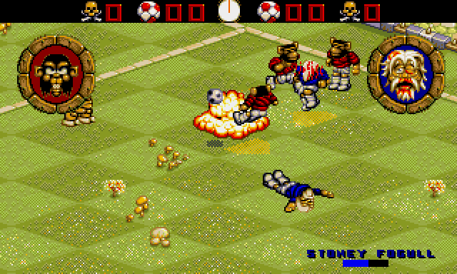Unlike its predecessor, the game uses an isometric viewpoint, perhaps because the original FIFA was so popular at the time. A number of vicious moves are on offer, with tackles Vinnie Jones would flinch at along with lethal head-butts and shoulder barges. If a game finishes drawn, it goes into a ‘Penalty Shoot Out’, which involves going round shooting the opposition;– the last team standing wins. The pre-match screens include attacking at defensive play styles, transfers and the chance to buy items such as rocket launchers and shields.
