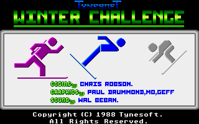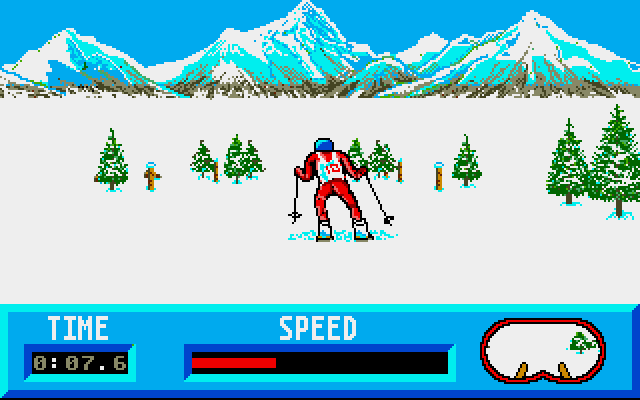 This is a winter sports game that lets you compete in five Olympic events: Downhill skiing, Biathlon, Slalom, Ski Jump and Bob Sled. It is very similar to offerings like Winter Games from Epyx.
