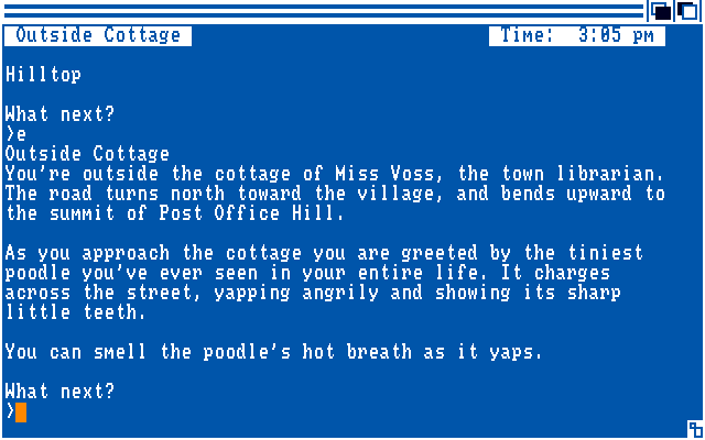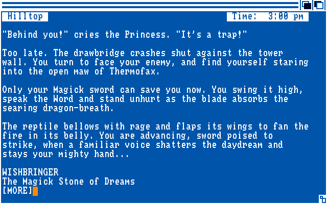 Wishbringer is a text adventure set in the Zork universe. The player types in commands to navigate the character, interact with the game world, and solve puzzles. The game has a rather open-ended structure, with many situations possessing several solutions; the player can opt for a "magical" approach to the tasks, using the titular stone, or attempt to solve the game in a more straightforward way.