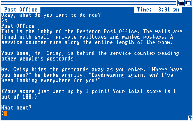 In this game, the player controls a postal clerk in the small fishing village of Festeron. The postmaster, Mr. Crisp, orders the player to deliver an envelope to the owner of Ye Olde Magick Shoppe. However, this seemingly innocent task inexplicably leads to a strange phenomenon: as the hero steps out, he finds that Festeron has been mysteriously transformed into a dark, ominous town called Witchville. Even cute little poodles have turned into hellhounds! Finding the Wishbringer, a stone that grants seven wishes to those who possess the right objects, seems like the only solution - or is it?